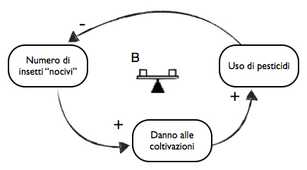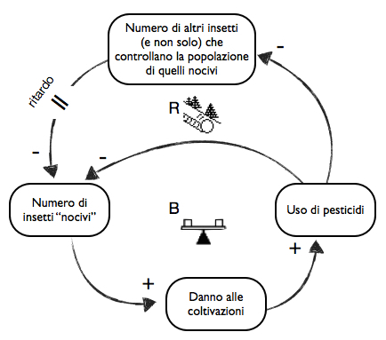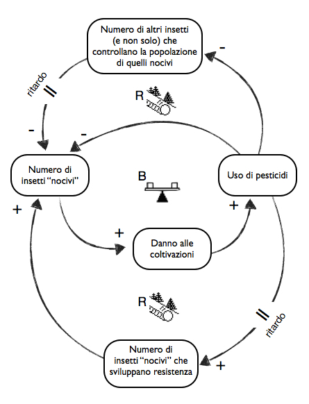 Si crea un Circolo di Rafforzamento che alla lunga porterà la popolazione degli insetti responsabili dei danni alle coltivazioni a crescere più di quanto fosse all’inizio: questo specifico modello di eventi è talmente diffuso nei sistemi dinamici complessi da essere noto come uno degli Archetipi Sistemici, il Fixes that Fail – Soluzioni che Falliscono.