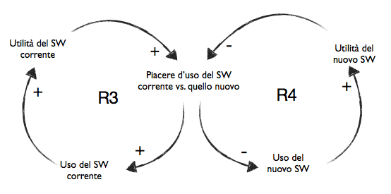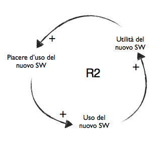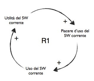 Lo hai riconosciuto, è un Circolo di Rinforzo: il comfort (o piacere d’uso) del SW corrente ne provoca l’utilizzo, l’utilizzo continuato ne aumenta l’utilità percepita che, a sua volta rinforza il comfort.